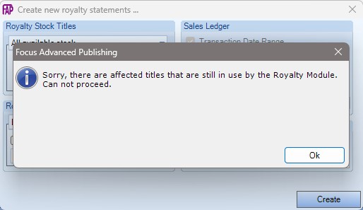Sorry, there are affected titles that are still in use by the Royalty Module. Can not proceed.